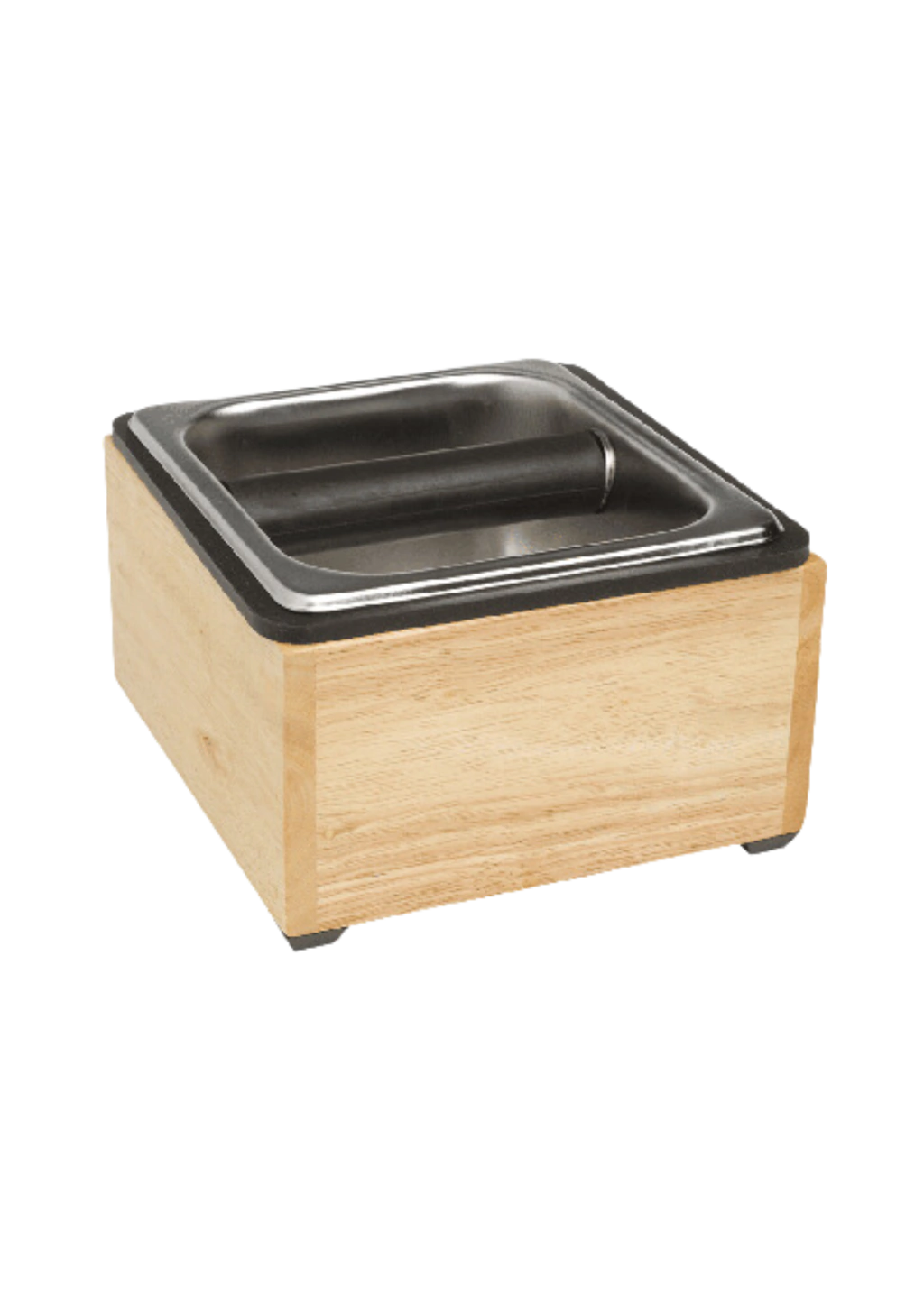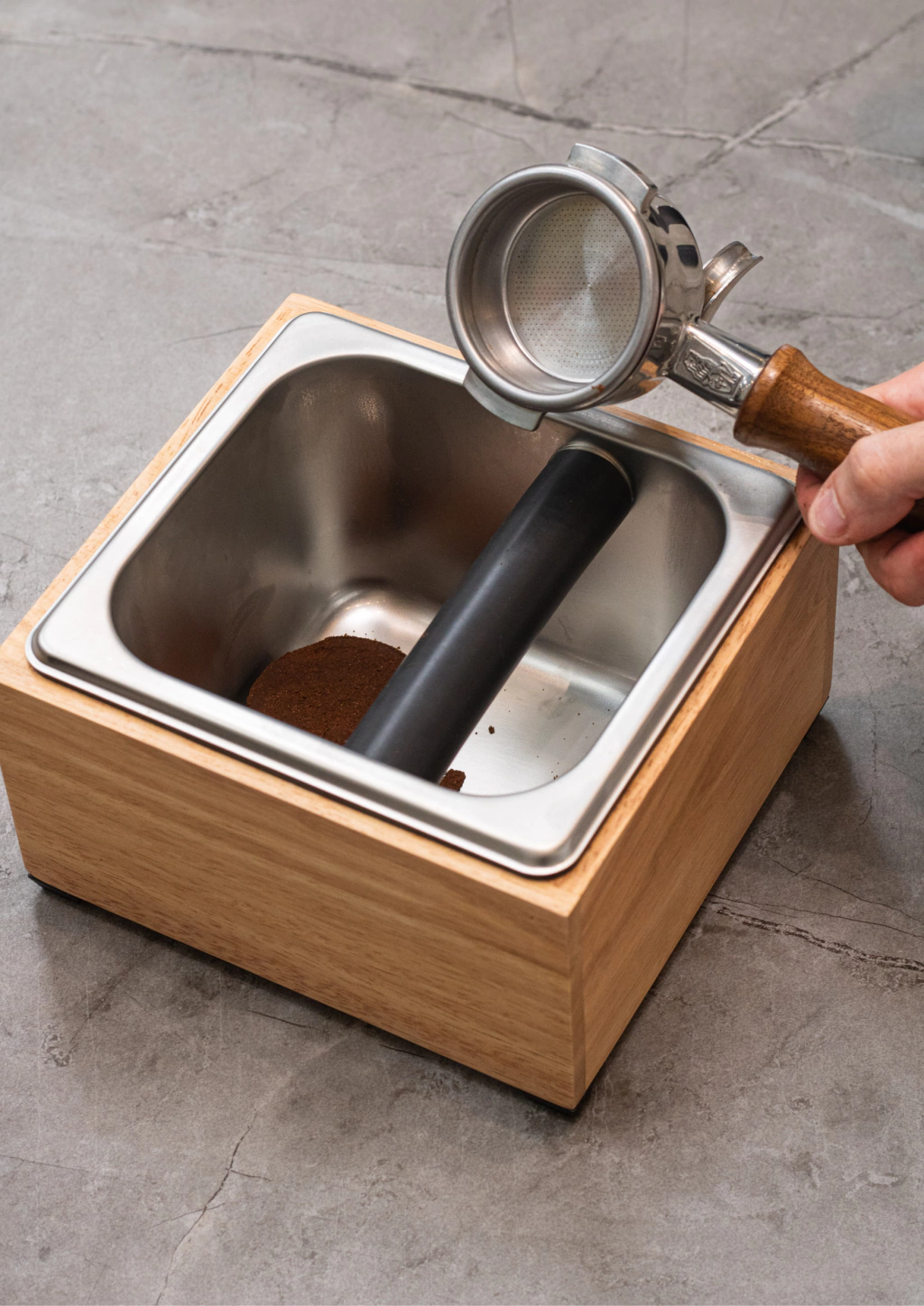 Knock Box de madera de arce diseñado para depositar los restos de borra del portafiltro al final de la extracción. Permite trabajar cómodamente, haciendo más dinámico el proceso de elaboración del café, manteniendo los accesorios y el espacio de trabajo limpios.