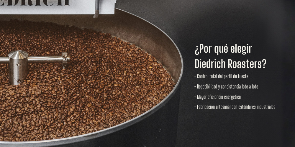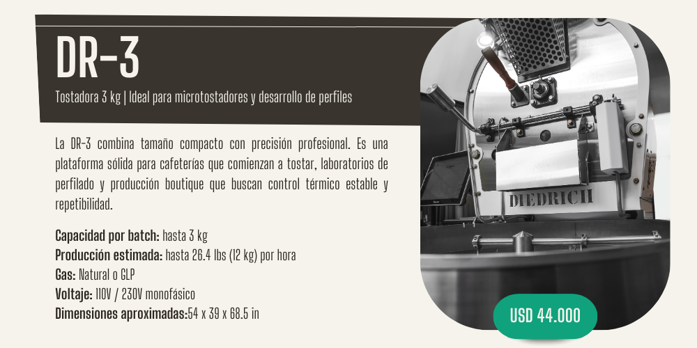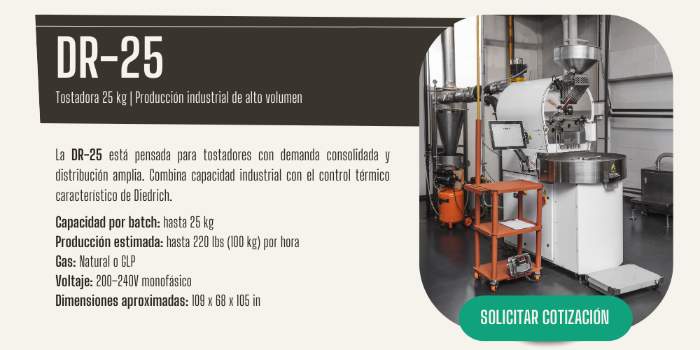 Diedrich Roasters desarrolla equipos de tostado diseñados para ofrecer control térmico estable, repetibilidad y consistencia en cada lote. La línea DR combina construcción robusta en acero, sistemas semi-automatizados y una arquitectura térmica que permite trabajar con precisión tanto en pequeños lotes como en producción comercial.