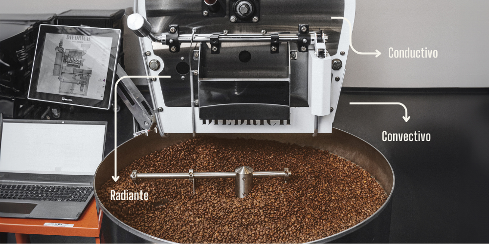 La línea DR de Diedrich Roasters está diseñada para ofrecer estabilidad térmica real, repetibilidad y control preciso en cada lote. Su arquitectura combina tres formas de transferencia de calor que trabajan de manera integrada durante todo el proceso de tueste.